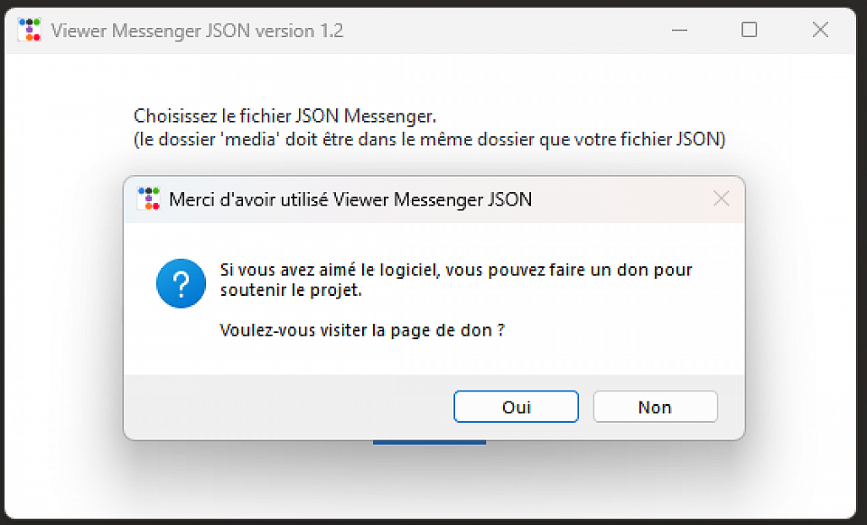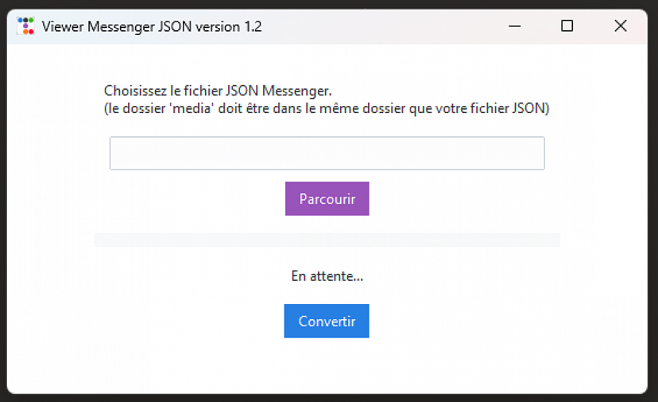 Viewer Messenger JSON est une application Windows qui permet de visualiser facilement les conversations sauvegardées de Messenger exportées au format JSON, sans connaissances techniques.